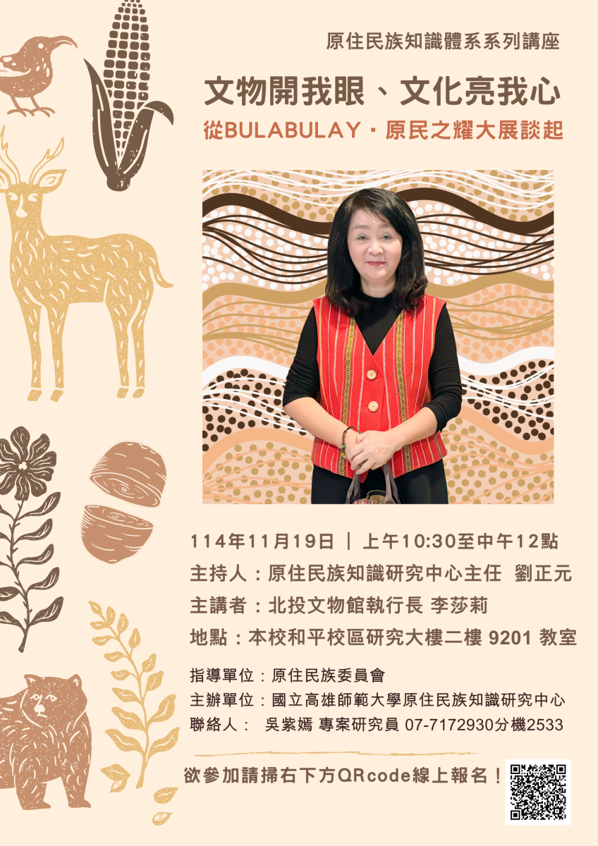 同學踴躍報名! 「原住民族知識體系系列講座」——〈文物開我眼、文化亮我心:從 bulabulay • 原民之耀 大展談起〉 誠摯邀請對原住民族文化、歷史、文物保存與展覽策劃有興趣的同學參加,一同從文物展覽的視角探索族群文化的多元價值與當代意義。