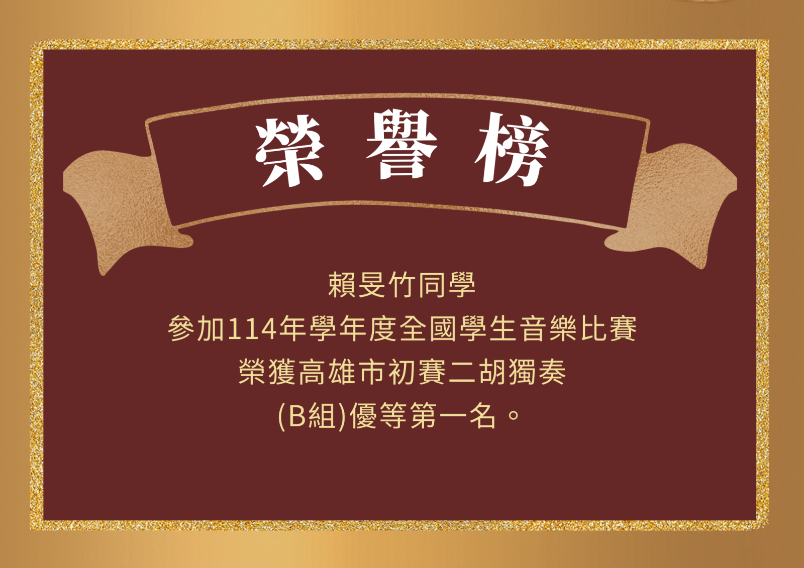 恭賀賴旻竹同學參加114學年度全國學生音樂比賽榮獲高雄市初賽二胡獨奏 (B組)優等第一名。