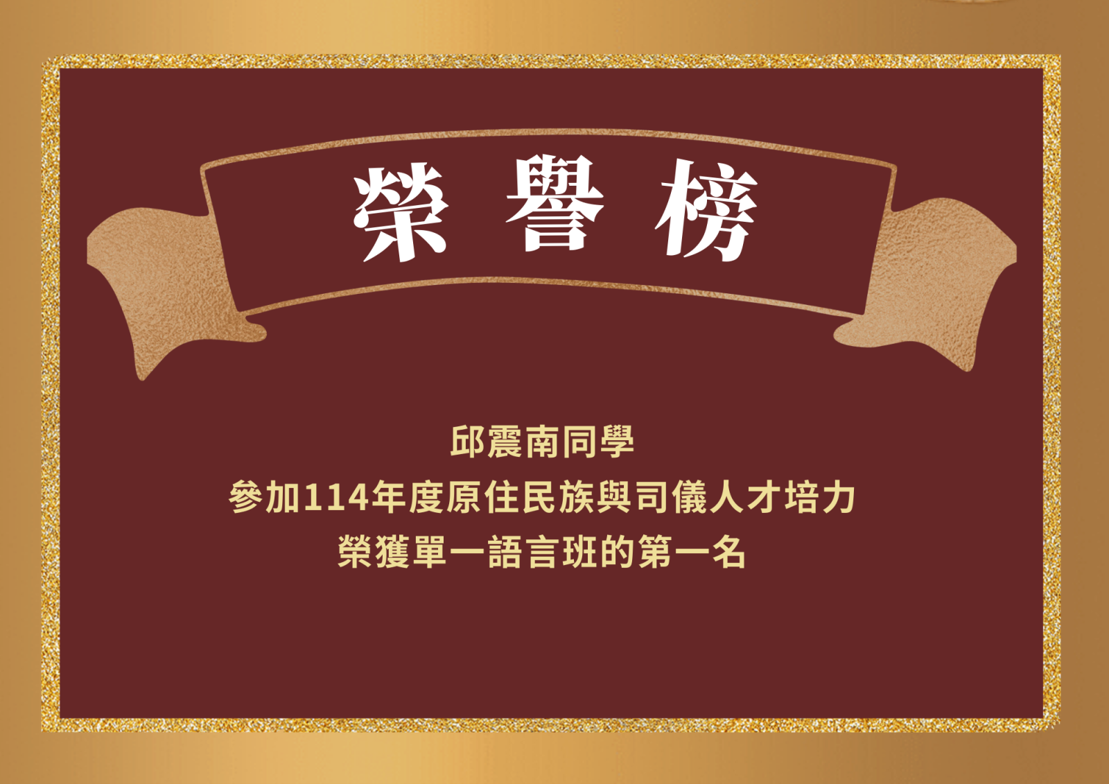 恭賀邱震南同學參加114年度原住民族與司儀人才培力榮獲單一語言班的第一名