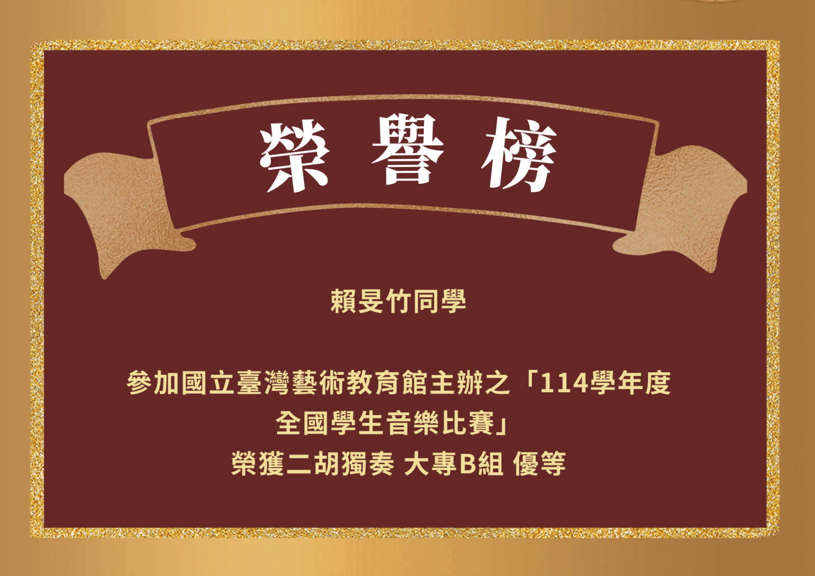 恭賀賴旻竹同學參加國立臺灣藝術教育館主辦之「114學年度全國學生音樂比賽」榮獲二胡獨奏 大專B組 優等。